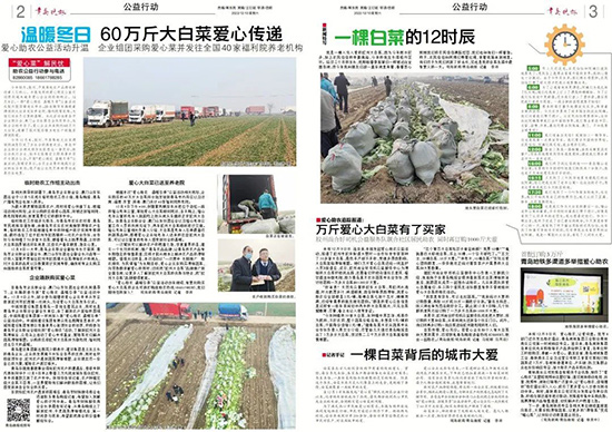 根據(jù)本次”愛心助農(nóng) 溫暖冬季“公益活動相關(guān)規(guī)劃,企業(yè)購買的60萬斤大白菜將分批發(fā)放到青島市內(nèi)四區(qū)以及濟(jì)南、淄博、東營、珠海、澳門共計40家福利院養(yǎng)老院。